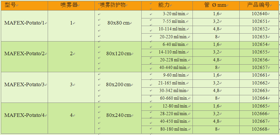 Mafex(马铃薯和水果)有优质的喷雾装置,以ULV(超低容量)技术为基础。通过此技术,大大减少了药物的使用量,由于大小均匀的喷头使药物最佳的作用于产品表面。设备已经被使用若干年,特别是用于收获后的马铃薯喷抑芽剂和杀菌剂,为水果打蜡和喷杀菌剂起到了最佳的保护效果。