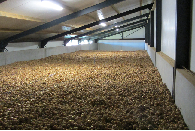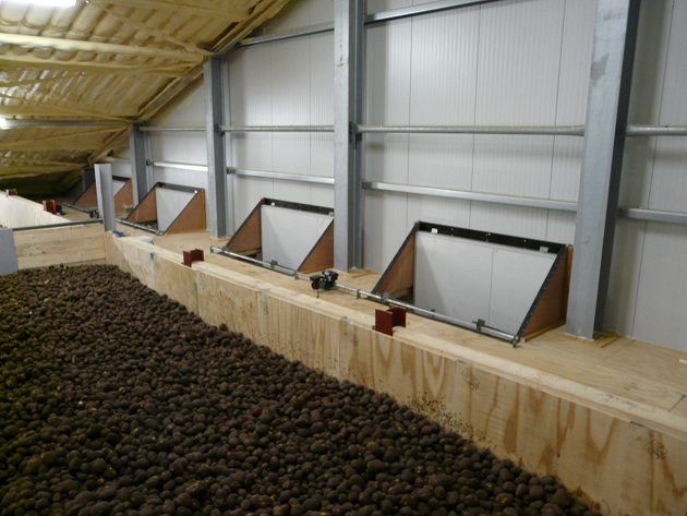 堆垛高度可达4至5米,是一种储存期较长的仓储形式,散装及袋装仓储可以带来高质量的产品与较低廉的仓储成本。无论您储存的是砂质土壤中收获的马铃薯或者是潮湿气候下的洋葱,牧易仓储可为您提供完整与正确的仓储通风系统。整套系统加热,机械制冷,加湿系统可以根据气候条件不同而灵活配置。